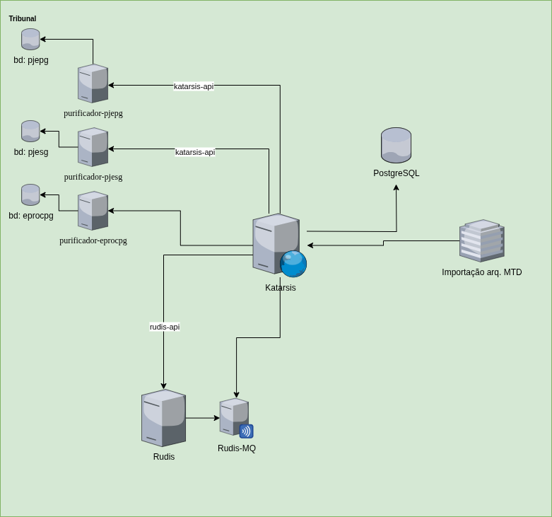 - Katarsis: único serviço que acessa diretamente a base de dados do sistema processual, necessita de RW em schema/tabelas específicos para realizar updates de correção.