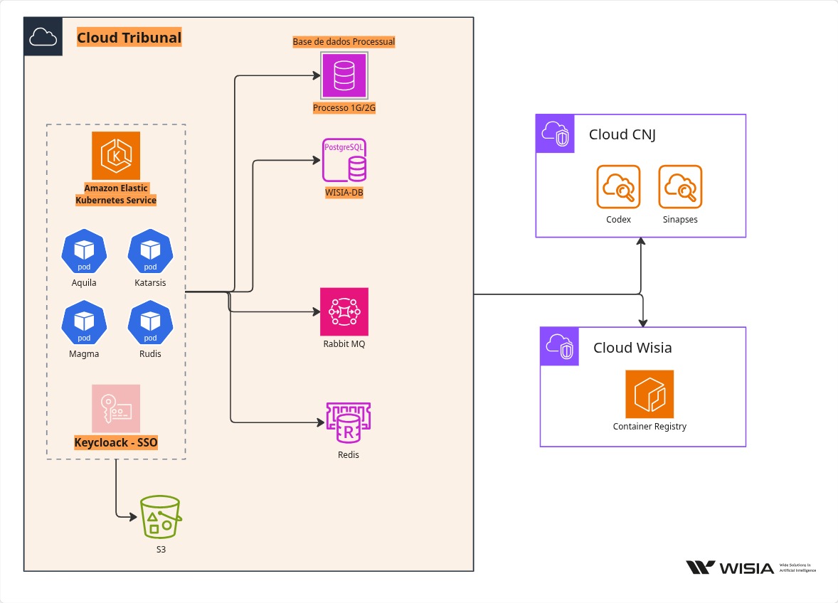 Externamente: HTTPS 443 para CNJ (Codex/Sinapses) e para Wisia Registry (pull de imagens). As bases processuais são internas e acessadas via DB read-only ou APIs internas.