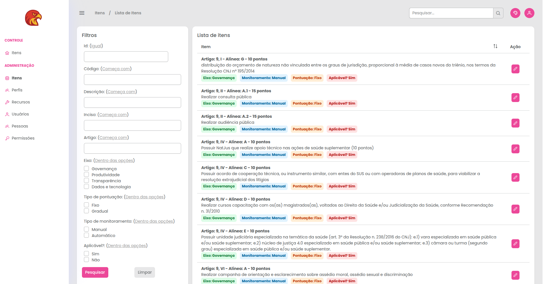 Cadastro e Filtros de Itens: pesquisa e gestão de itens vinculados a artigos, incisos e eixos (Governança, Produtividade, Transparência, Dados e Tecnologia).